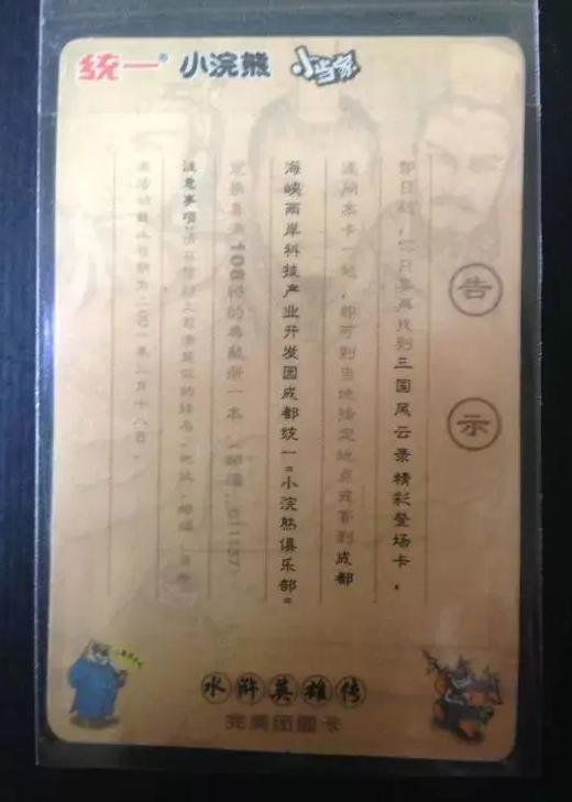 在这一年里,统一推出水浒英雄传系列卡片。卡片全套共114张,由108将与6大恶人组成,系列卡片并非一次性发布,而是按照每个月制作3~5张人物卡的节奏,分批绘画制作,夹在小浣熊和小当家两款干脆面中上市。
