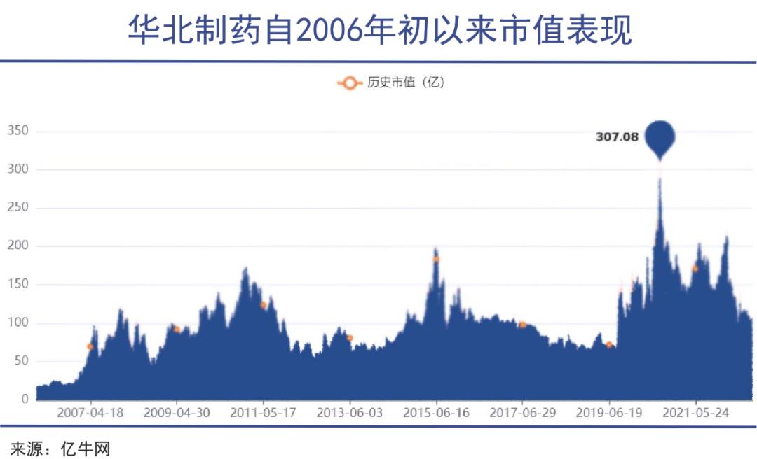 华北制药在2000年时就已经摸到百亿市值的门槛,现在仍在百亿线上晃悠,20年里目送了一众“小弟”赶超自己。