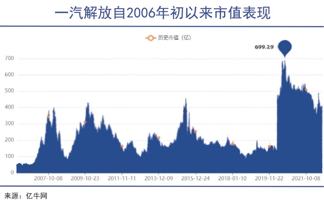 一汽解放早在2008年时就曾经达到过400亿市值。等于十几年时间里一直在原地踏步。目前中国一汽旗下三家上市公司,总市值加起来仅500亿左右。