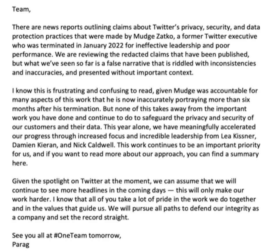 在一份内部邮件中,阿格拉瓦尔回应了扎克特的投诉。他表示,扎克特被解雇是因为“领导无能和表现不佳”。公司正在审查举报信中的说法,但迄今为止发现这这封举报信“充满不一致和不准确的错误叙述,并且没有提供重要的上下文信息”。