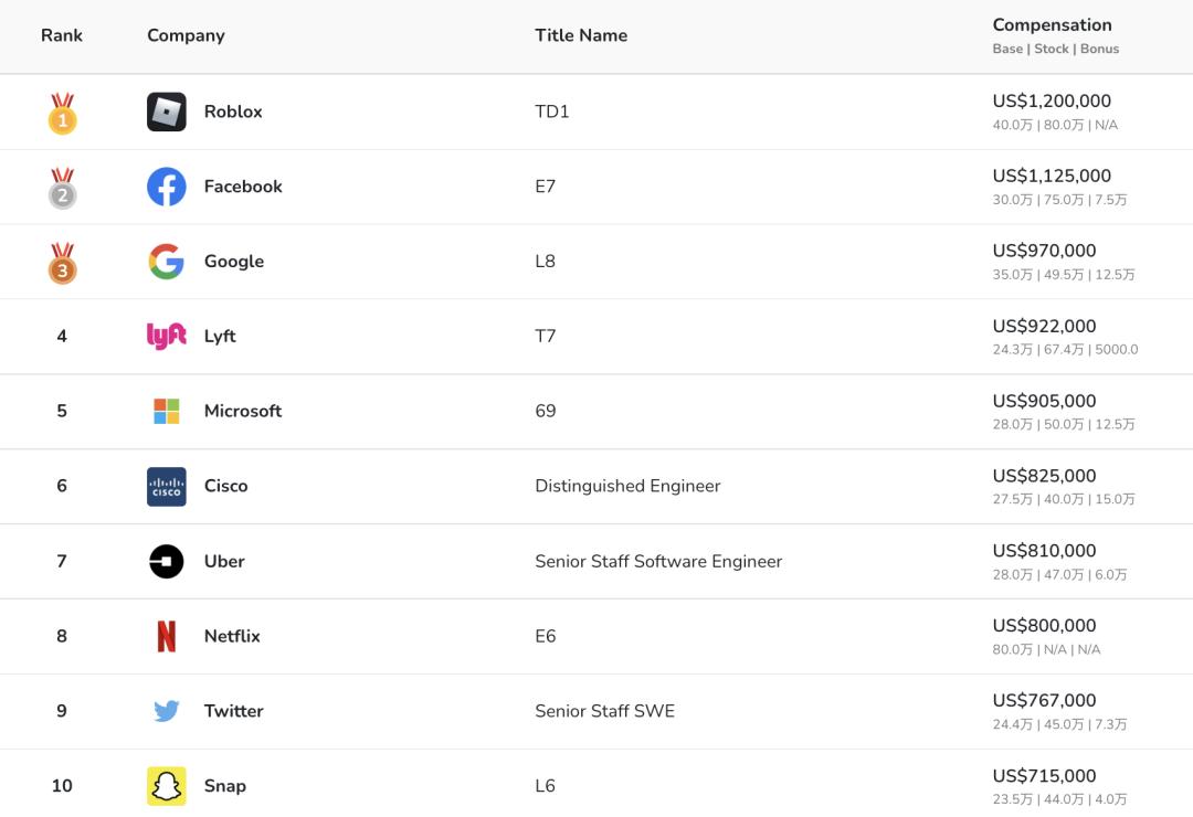 数据显示,字节跳动高级工程师年薪44.3万美元(303万元)位列第6,Roblox为首席工程师开出了120万美元(823万元)的天价。