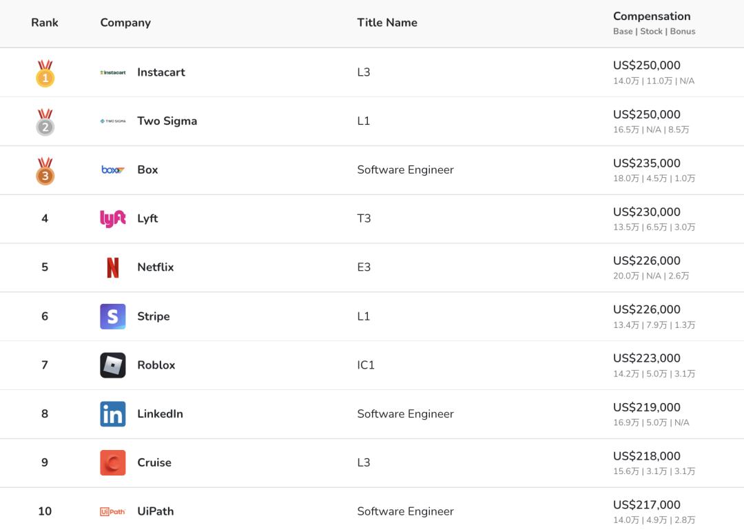 排名前十的公司中,可以看出为这些经验较少的程序员开出年薪中位数均都超过了20万美元(约137万元),其中就包括Roblox、Linkedin、网飞等有名企业。提供零售配货服务的Instacart以25万美元居首。