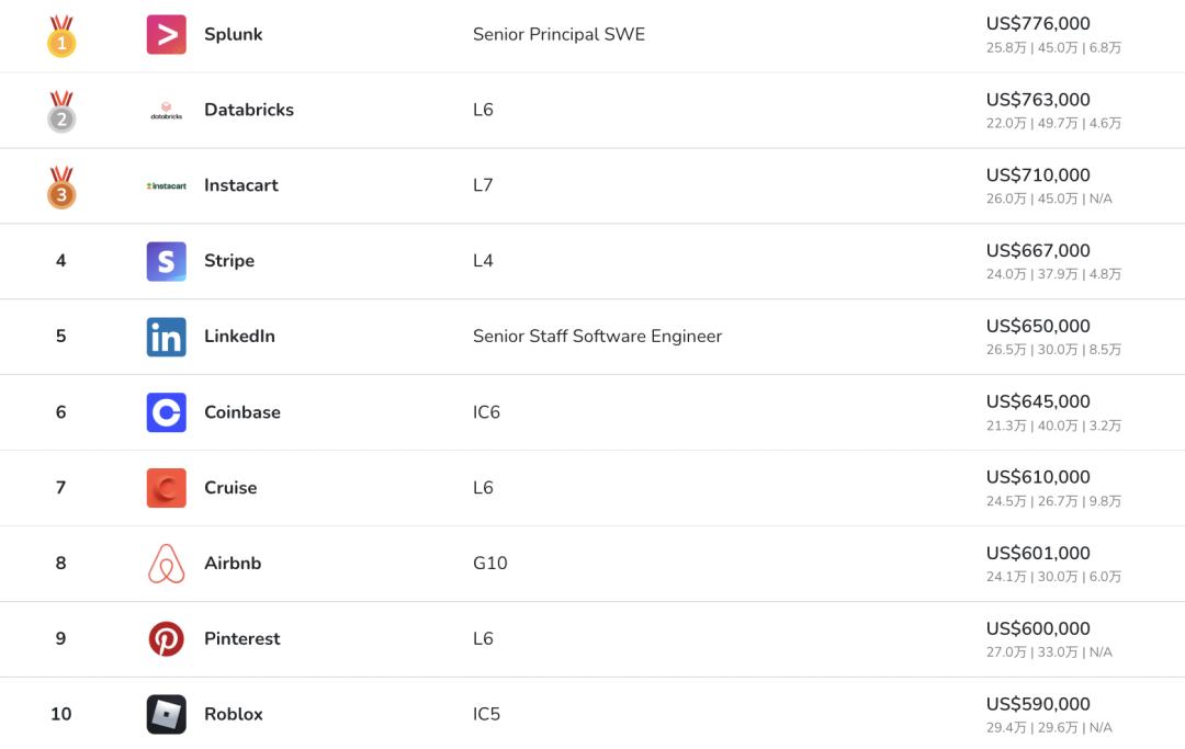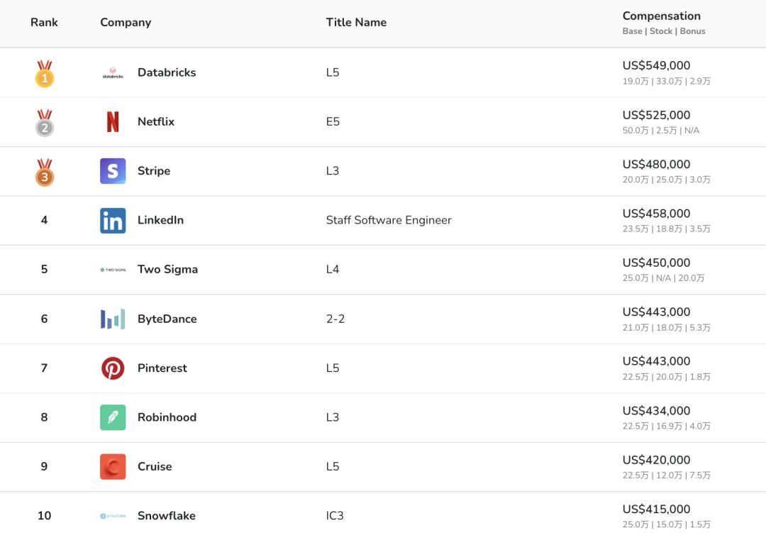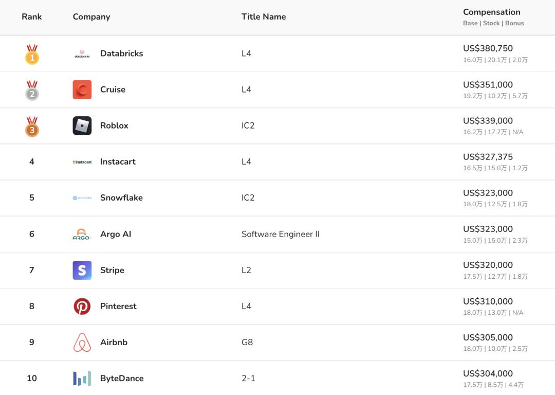 美国企业软件公司Databricks为高级工程师开出的年薪中位数为54.9万美元,位列第一。字节跳动以44.3万美元(约303万元)名列第6,对应工程师级别为2-2。