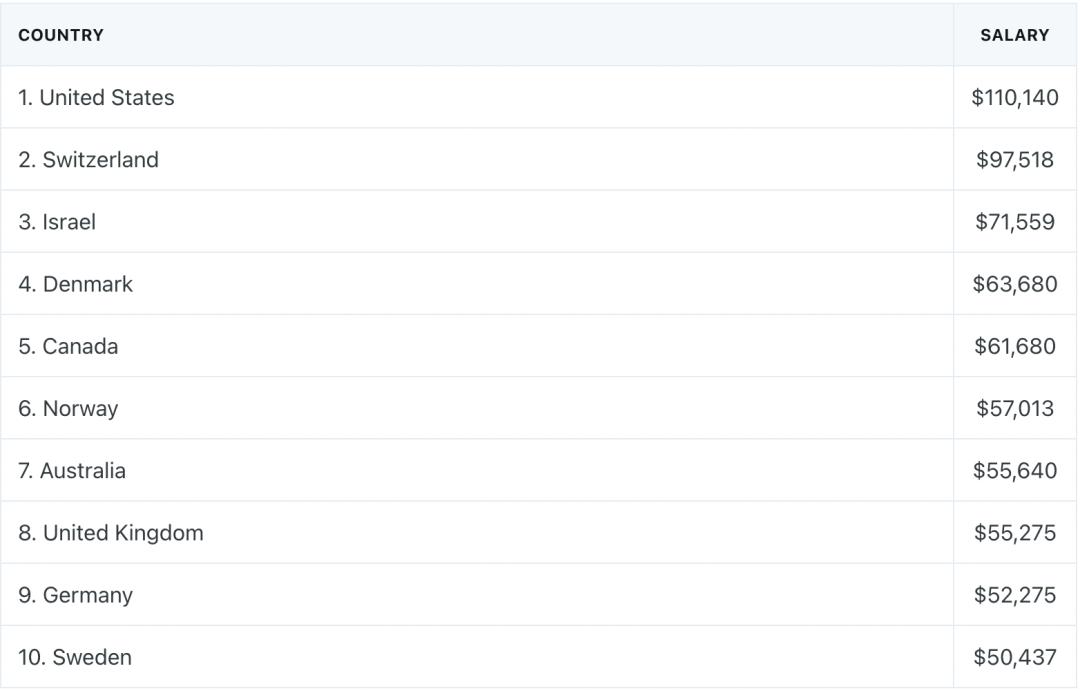 根据codesubmit数据,美国位列榜首,开发者平均薪酬为11万美元(75万元),瑞士和其他几个欧洲国家则紧随其后。