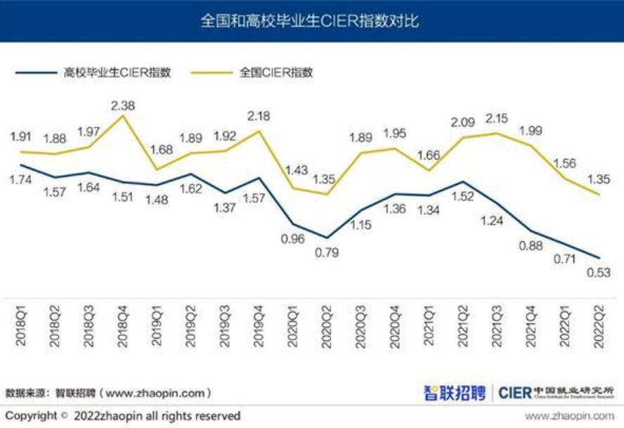 结构性存在着人才缺口,但不愿下一线的「一张白纸」们仍然存在着就业困难。智联招聘发布的《2022 年二季度高校毕业生就业市场景气报告》中显示,高校毕业生 CIER 指数(高校毕业生就业市场景气指数)今年二季度为 0.53,已连续第四个季度下降,达到历史最低值,高校毕业生就业签约率不足 50%,其中,专科毕业生拿到 offer 的人数占比达 48%,高于普通本科生的 42.8%。