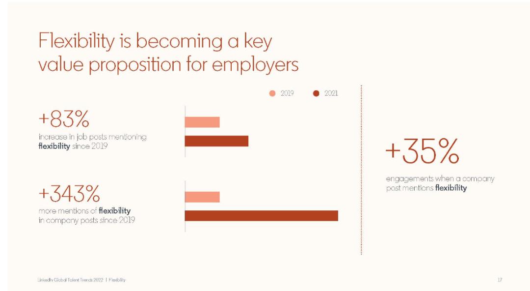 在领英中国(Linkedln)发布的《2022 人才趋势报告》中提及,目前就业市场的"灵活"趋势在全球范围内将持续扩大,自 2019 年以来,提及灵活性的职位发布数量增长了 83%,公司发布的动态中提及灵活性职位的次数增加了 343%,而公司发布的动态提到灵活性职位时,参与度提升了 35%。