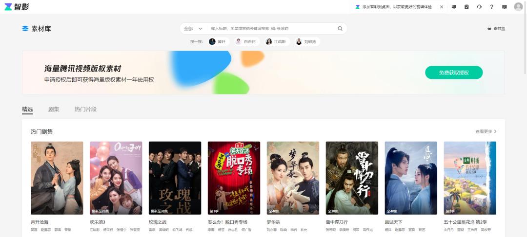 而相比较剪映、必剪等视频剪辑软件,智影一大优势是接入了腾讯视频的大量独家版权,创作者在申请授权后便可获得这些版权素材的一年使用权。