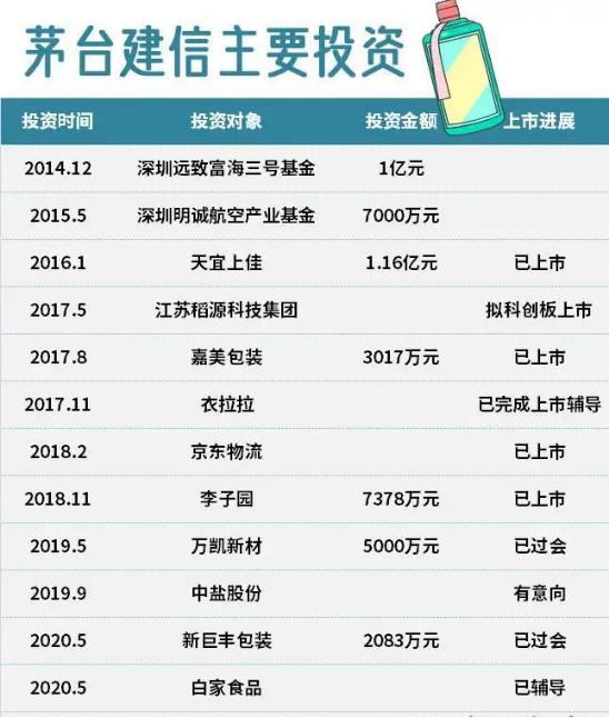 茅台直投了李子园、白家食品、锅圈食汇、匹克体育等品牌,还投资了嘉美包装、万凯新材等项目,在其所投的10个项目中,已有4家成功上市,余下的正在冲刺IPO。尽管茅台建信出手的频率不高,但个个投在刀刃上,收获颇丰。