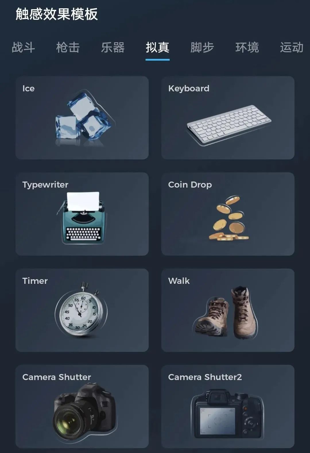 RichTap 里面模拟的振动效果十分丰富,比如日常生活中的键盘打字声或者相机快门声等等。
