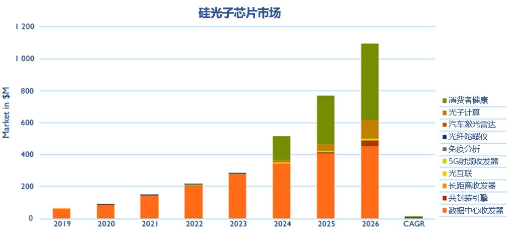 在需求与资源投入的双重驱动之下,近几年硅光产业呈现高速增长态势,根据知名半导体分析机构Yole的预测,硅光市场将从2020年的约0.87亿美元增长到2025年的约11亿美元,复合年增长率达49%。目前,硅光在光通信尤其是数通短距场景已取得局部商业成功,正在逐步拓展至光传感、光计算等新兴应用领域,尤其是光传感领域的可穿戴健康监测芯片,随着健康监测版本Apple Watch的发布,硅光将陆续打开市场局面并保持高速增长。