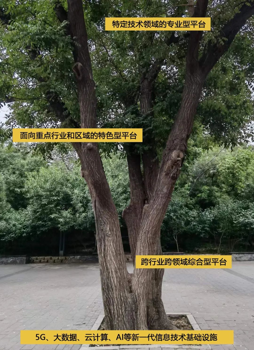 如果把三个层次的平台之间的关系可以比喻成一棵大树。那么,5G、AI、大数据和云计算等工业互联网基础设施是树根,综合性平台是树干,特色型平台是大树枝,而专业型平台则是小树枝。