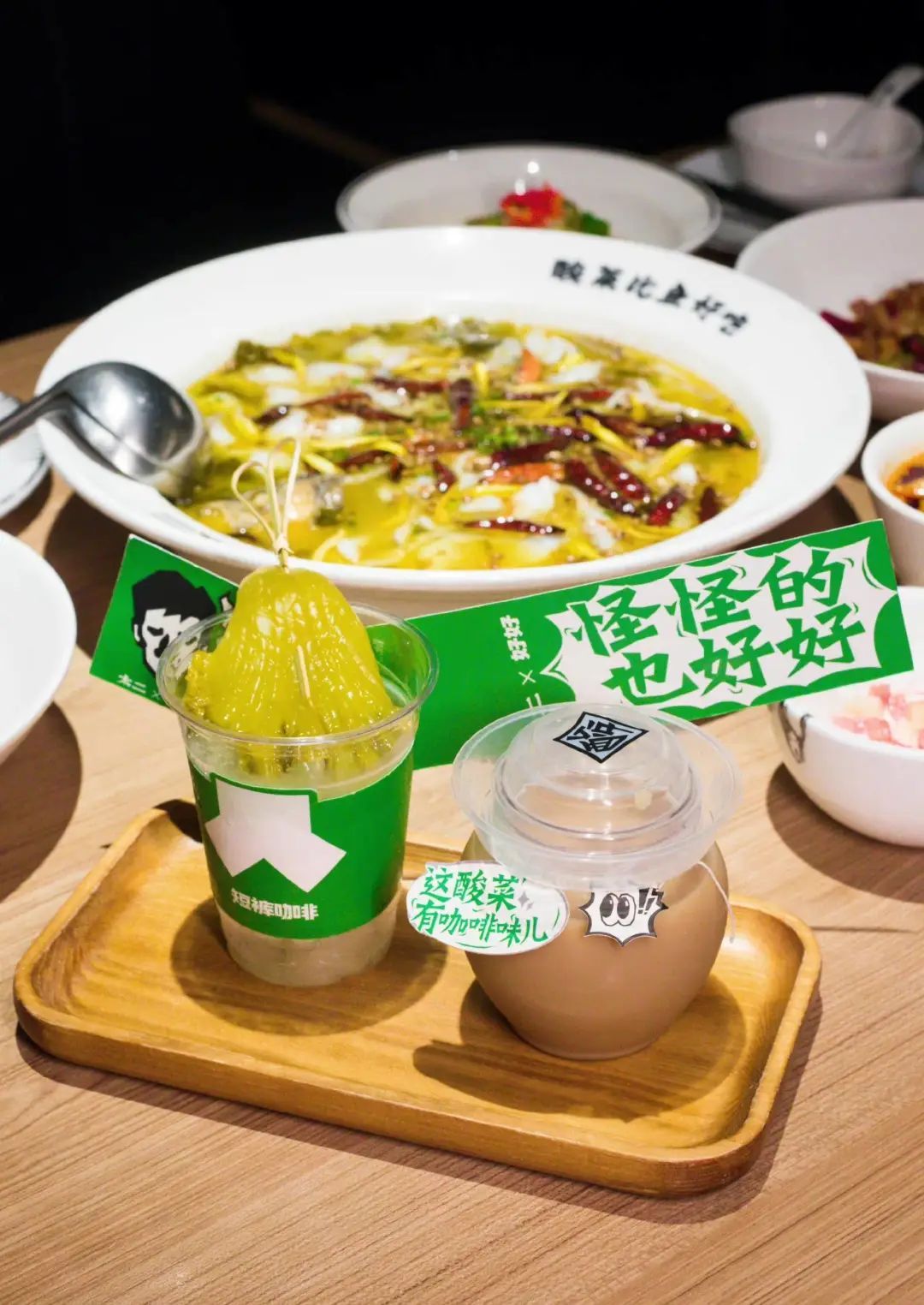 这是太二酸菜鱼和好好咖啡合作推出的一款新品,名为「原汁酸菜拿铁」。