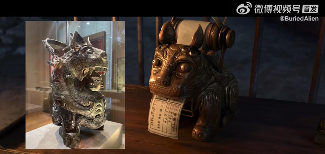电影里的宝莲灯,是参考了晚唐五代四川出土的黄釉莲花灯;自动青铜打印机,造型摘自商代晚期的青铜器虎食人卣。
