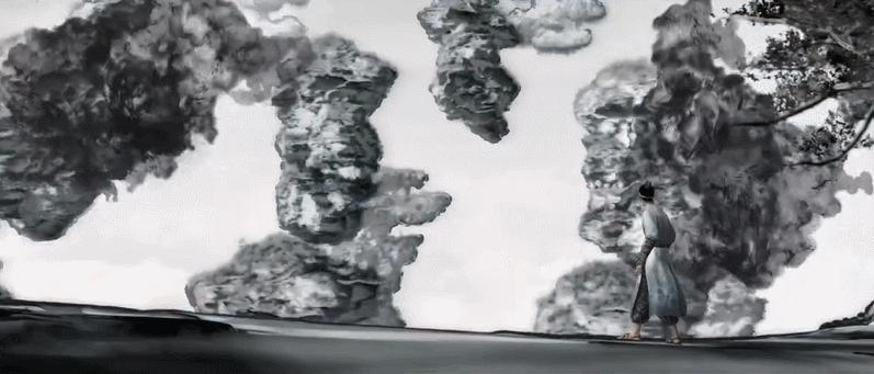 第二个名场面是,杨戬和师父在水墨太极图中的斗法,人如在画中行走,打斗充满中国画的写意感。
