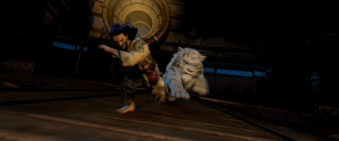 电影一开始,落魄的杨戬,是化名木二郎四处游荡的赏银捕手,虽然神力减弱,但有一文一武两个兄弟和啸天犬的帮助,开场就是激烈的视觉冲突。