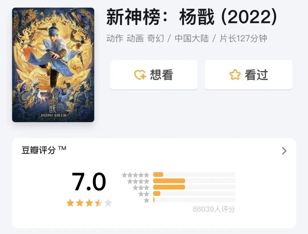 《哪吒》上映当天票房过亿,最终狂赚50亿,而《杨戬》上映10天,票房还没破3亿,评分也从7.1分,降到7分。