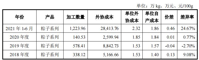五芳斋2018-2021年上半年自产与外协加工成本差异