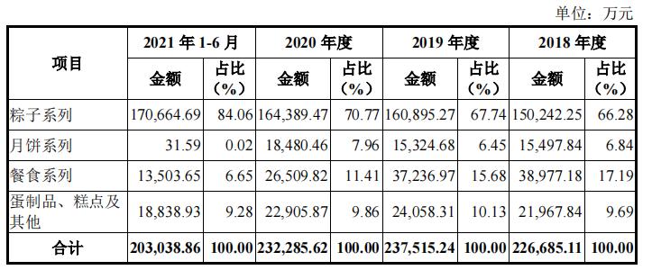 招股书显示,2018-2021年上半年,五芳斋营收分别为24.23亿元、25.07亿元、24.21亿元和21.36亿元。其中,来自粽子产品的营收分别为15.02亿元、16.09亿元、16.44亿元和17.07亿元,占比高达66.28%、67.74%、70.77%和84.06%。