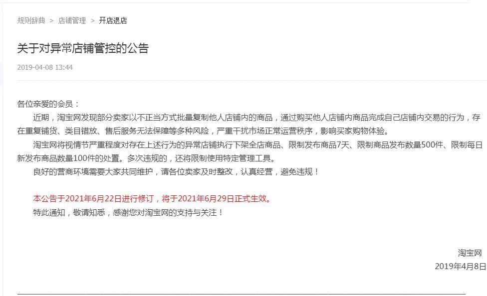淘宝虽无明确对“无货源店铺”的清理活动,但其对复制他人店铺商品照片等行为也作出严格限制。同时,2019年4月,淘宝网还发布《关于对异常店铺管控的公告》,称发现部分卖家以不正当方式批量复制他人店铺内的商品,通过购买他人店铺内商品完成自己店铺内交易的行为,存在重复铺货、类目错放、售后服务无法保障等多种风险,严重干扰市场正常运营秩序,影响买家购物体验,并对这些店铺作出下架全店商品等处置。[5]