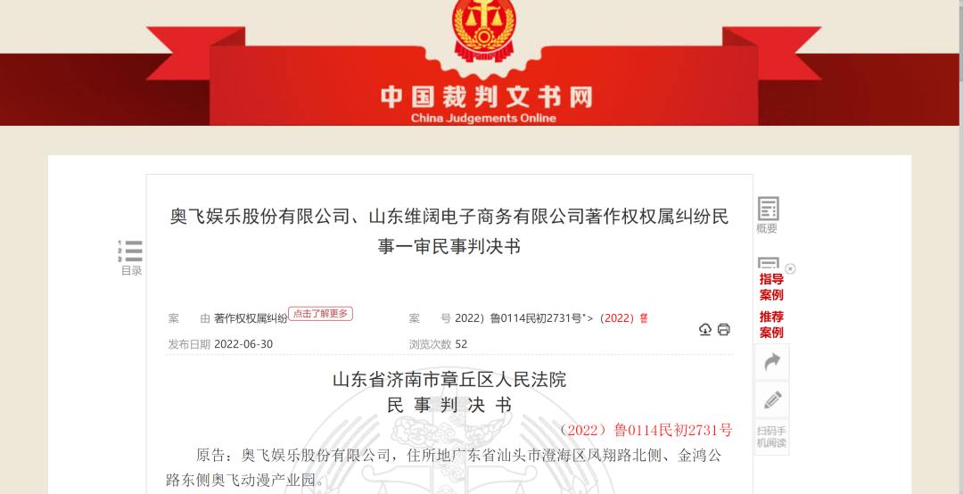 今年4月,奥飞娱乐 (SZ002292,股价4.96元,市值73.34亿元) 起诉山东维阔电子商务有限公司(以下简称山东维阔)著作权侵权案得到法院初审判决,后者在其拼多多店铺“大美丽的紫薇”中销售的拳击手套,就使用了奥飞娱乐享有著作权的“刑天侠”人物形象美术作品。 [6]