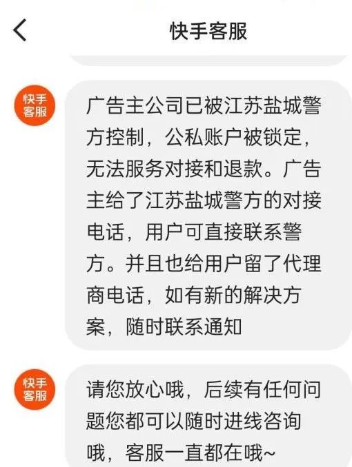 彭强是在快手视频里看到的无货源电商培训广告,他找快手平台进行了投诉。不过,快手客服告诉他,他们自己也联系不上该客户,他展示了快手客服给他的回复:广告主公司已被警方控制,公私账户被锁定。