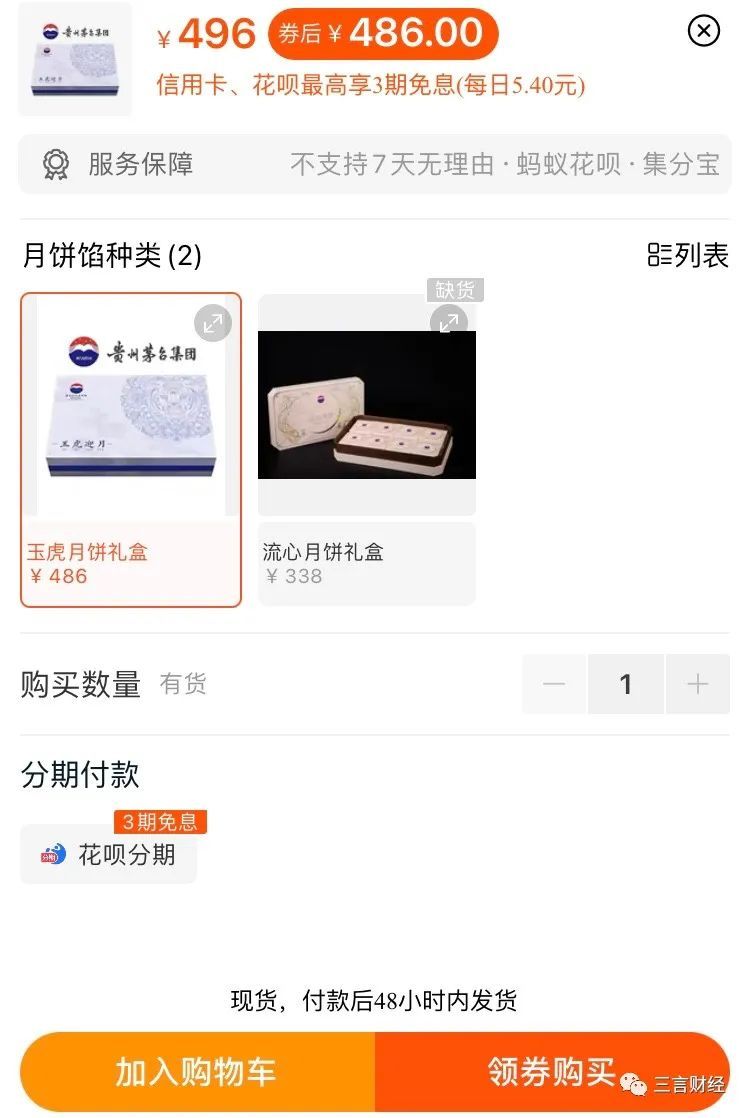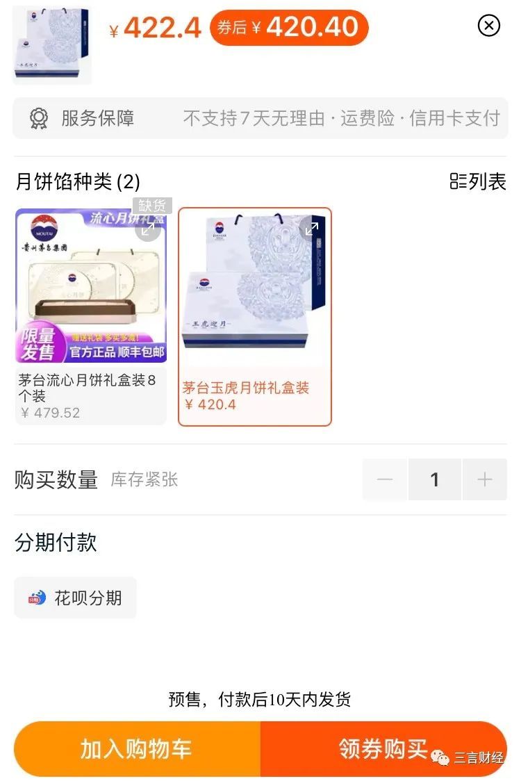 三言财经在淘宝找到三家售卖茅台月饼的店铺,其中一家的茅台玉虎月饼售价为券后420.4元;另一款茅台流心月饼售价479.53元,但是缺货。