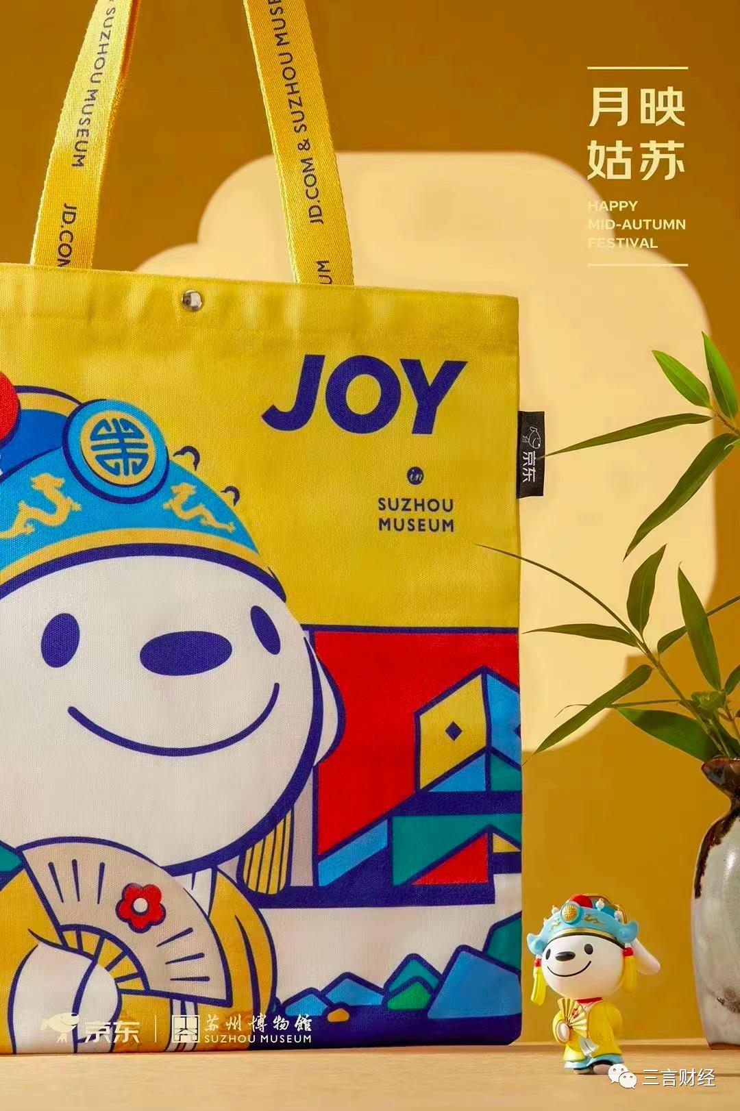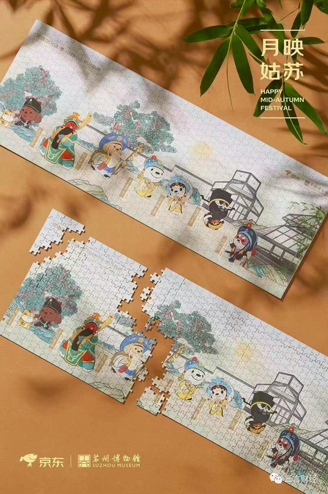 京东的中秋礼盒以环保为主题,月饼盒是用甘蔗渣制作的。除了月饼,还有用打捞的海洋塑料瓶制作的环保袋、以及与苏州博物馆联名定制的拼图和公仔。