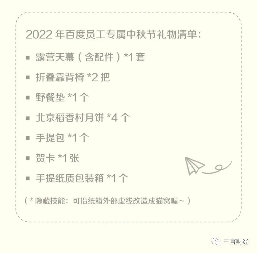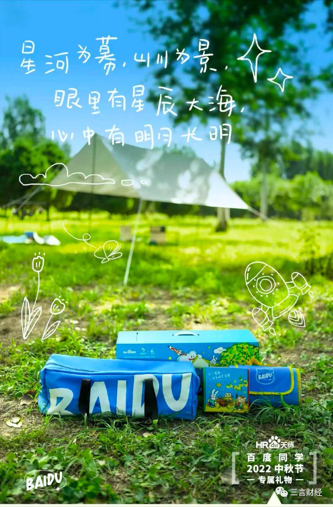 百度的员工专属中秋礼物除了月饼,还有露营套装。包括露营天幕、折叠靠背椅、野餐垫、手提包等等。