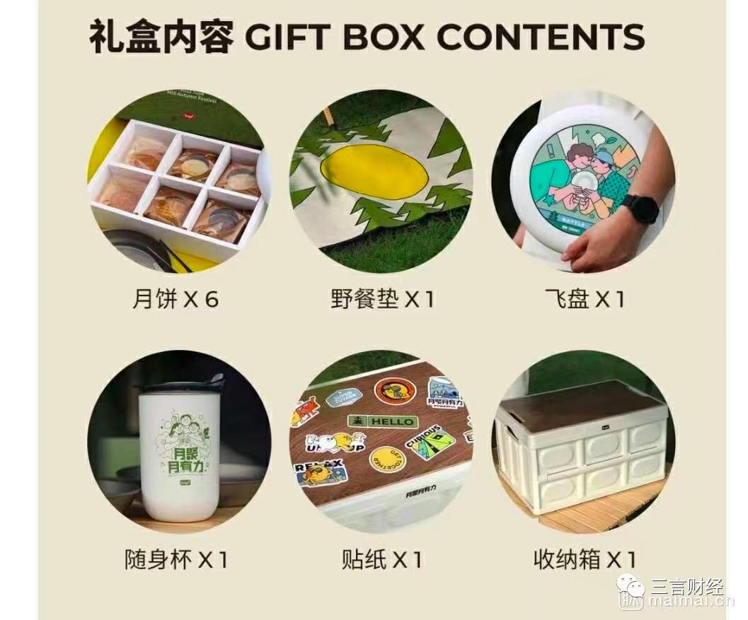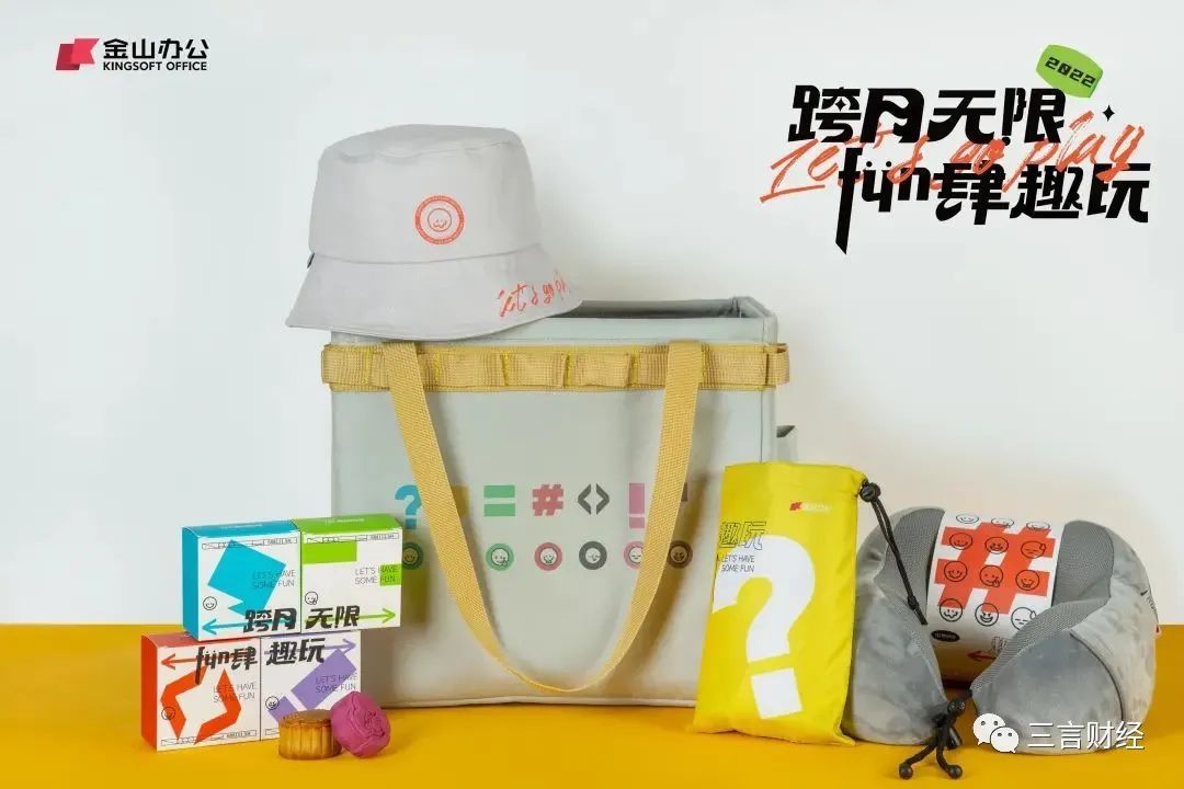 金山办公中秋礼盒的主题是“跨月无限,FUN肆趣玩”。除了月饼,还有折叠露营包、野餐垫、颈枕、渔夫帽、表情贴纸。