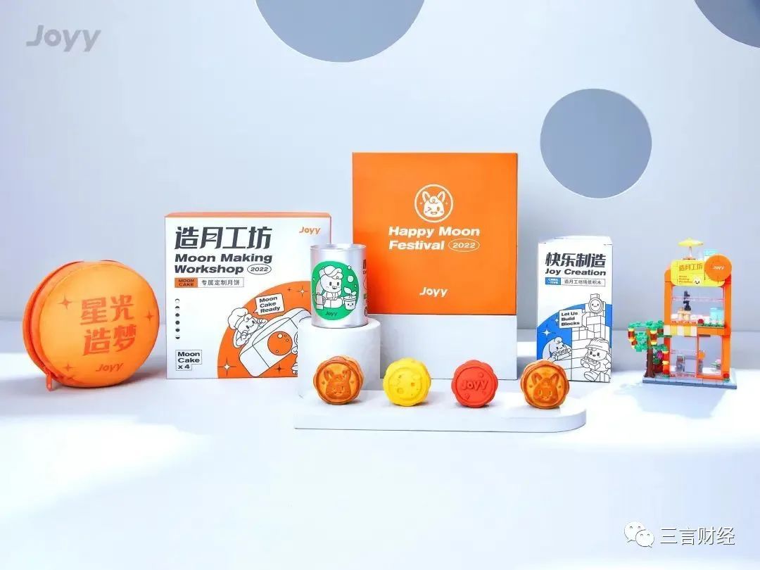 欢聚集团的中秋礼盒包装是定制木箱和皮套,除了月饼,还有眼罩颈枕、植物盲盒、积木。