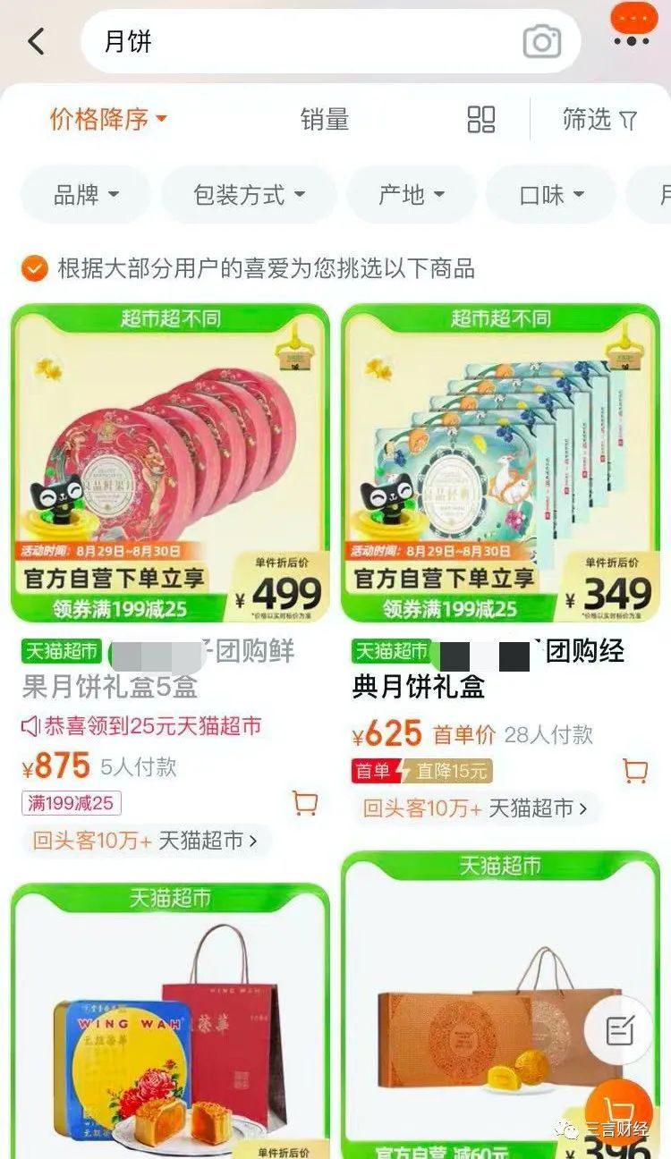 天猫超市中售价最高的月饼虽然标价为875元,但有折扣活动,折后价499元。
