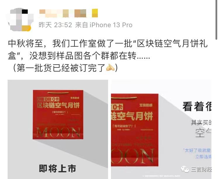 有网友称,其工作室做了一批“区块链空气月饼礼盒”,没想到样品图各个群都在转。该网友还表示,第一批“区块链空气月饼礼盒”已经被订完了。