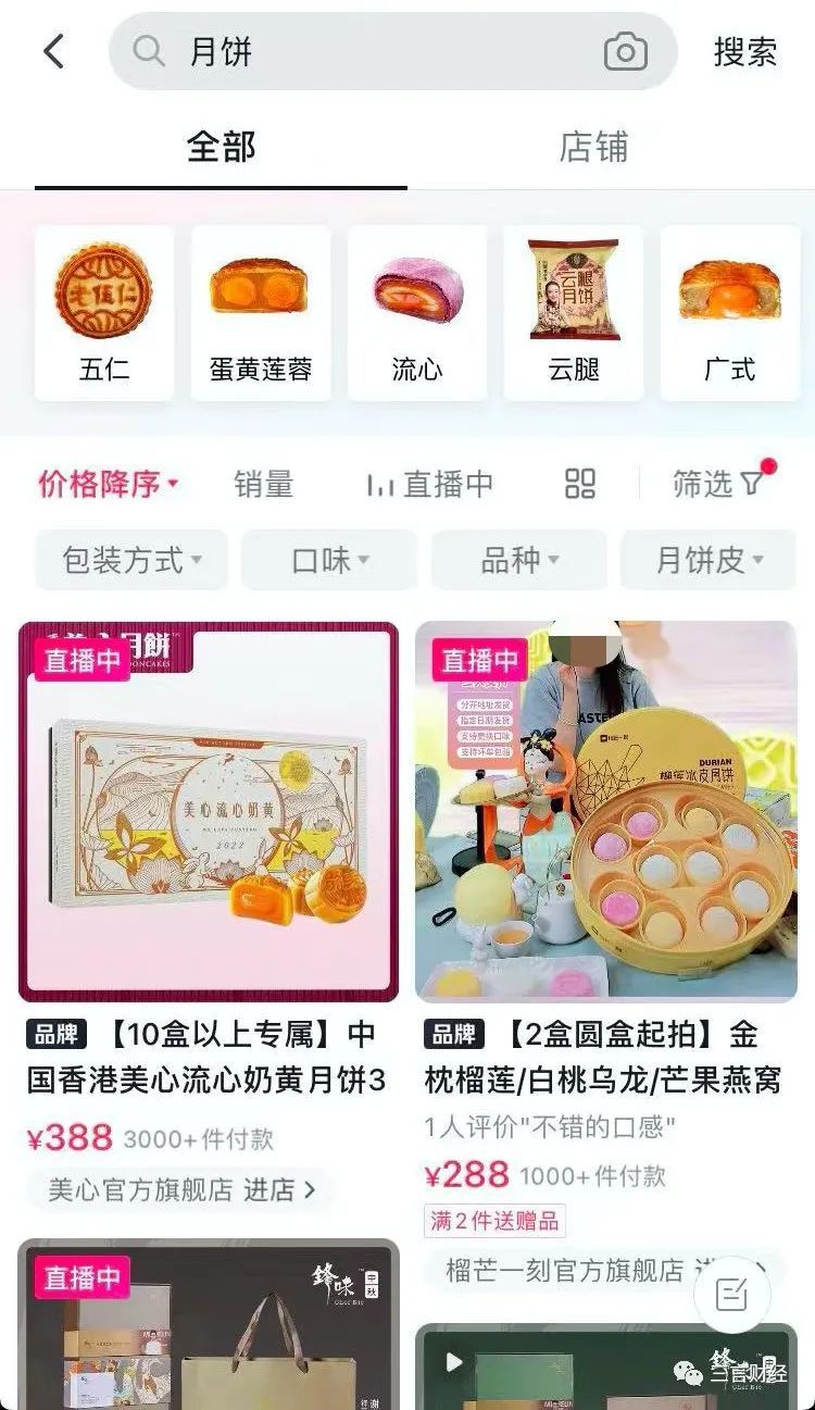 抖音商城在售的月饼类别有五仁月饼、蛋黄莲蓉月饼、流心月饼、云腿月饼、广式月饼、苏式月饼,以及礼盒装等。售价最高的388元。
