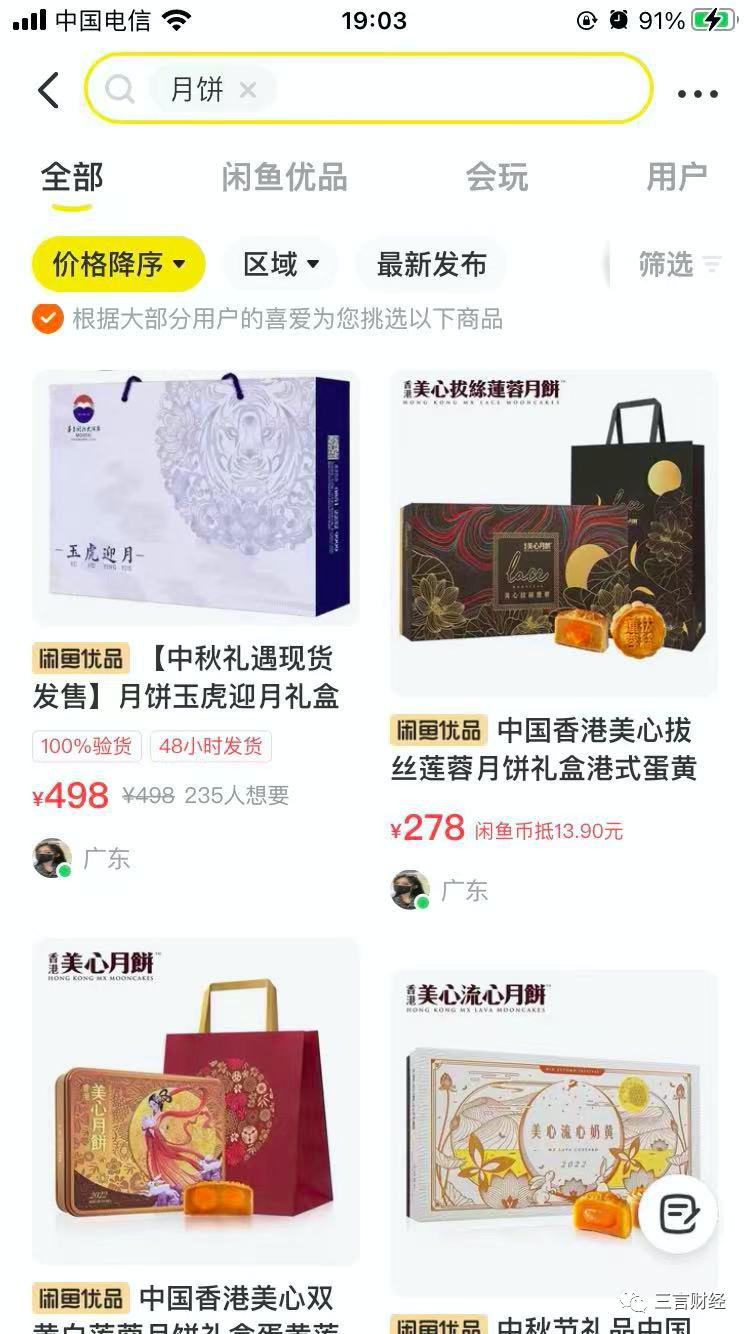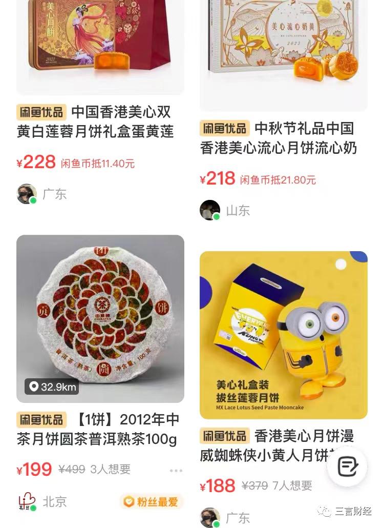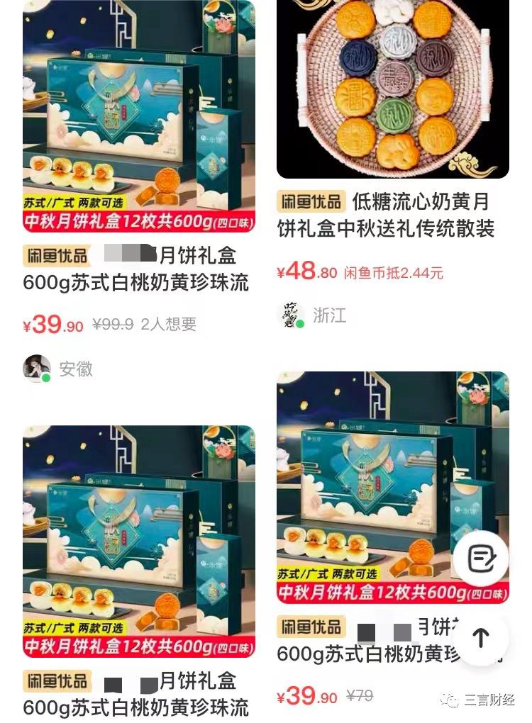 闲鱼上售卖的月饼礼盒,售价大多为几十元。