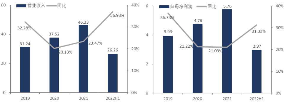 2019-2022H1珀莱雅营收和净利润,单位:亿元 资料来源:公司财报,36氪