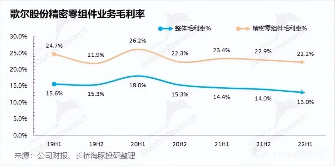 歌尔股份精密零组件业务 2022 年上半年毛利率为 22.2%,同比下滑 1.2pct。公司精密零组件毛利率下滑主要由原材料涨价和下游需求疲软影响。