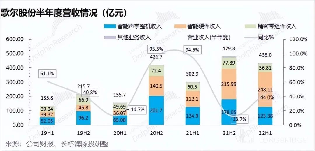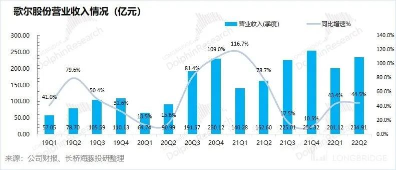 歌尔股份 2022 年第二季度总营收 235 亿元,同比增长 44.5%,超市场预期(222 亿)。公司营收已经连续两个季度增速达到 40% 以上,走出了去年下半年的增速放缓 “泥潭”。