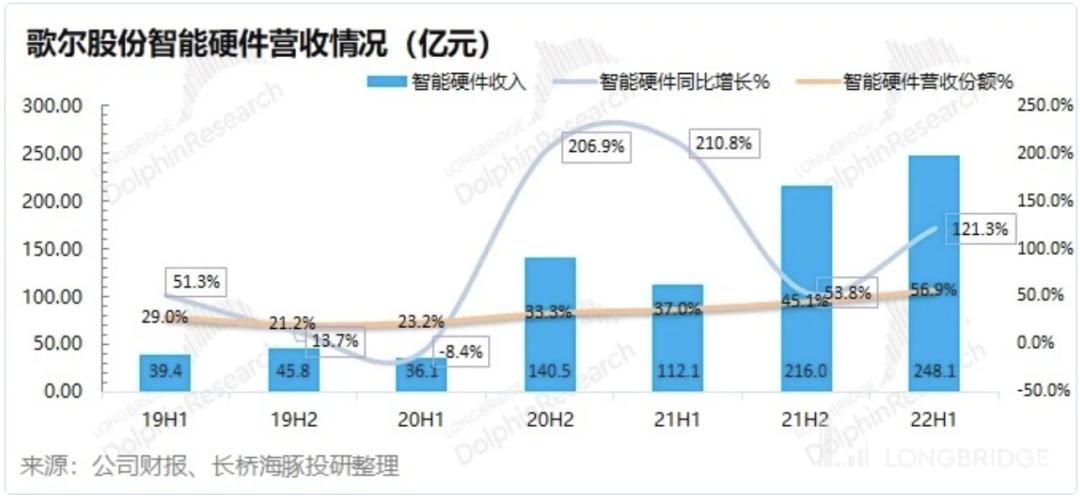 歌尔股份智能硬件业务 2022 年上半年实现收入 248.1 亿元,同比增长 121.3%。随着 Oculus、Pico 和 PS 产品的出货增长,公司智能硬件业务已经成长最大的收入来源,首次突破 50%。