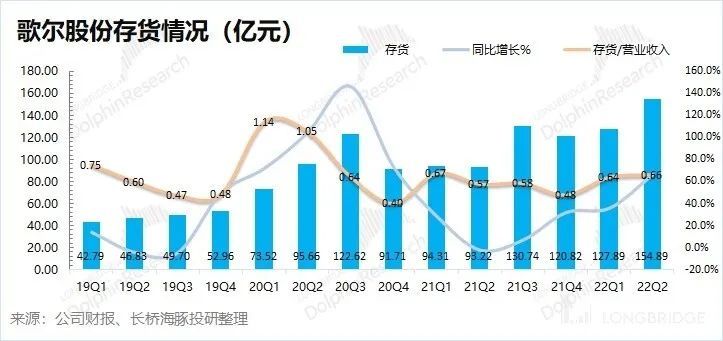 ②存货:歌尔股份 2022 年第二季度存货 154.89 亿元,同比增长 66.2%。从存货/营业收入指标看,歌尔股份本季度继续上升至 0.66。歌尔存货水平比 2021 年整体较高,主要是因为 Airpods 和手机业务的需求趋于疲软,整体仍在相对合理的水平。