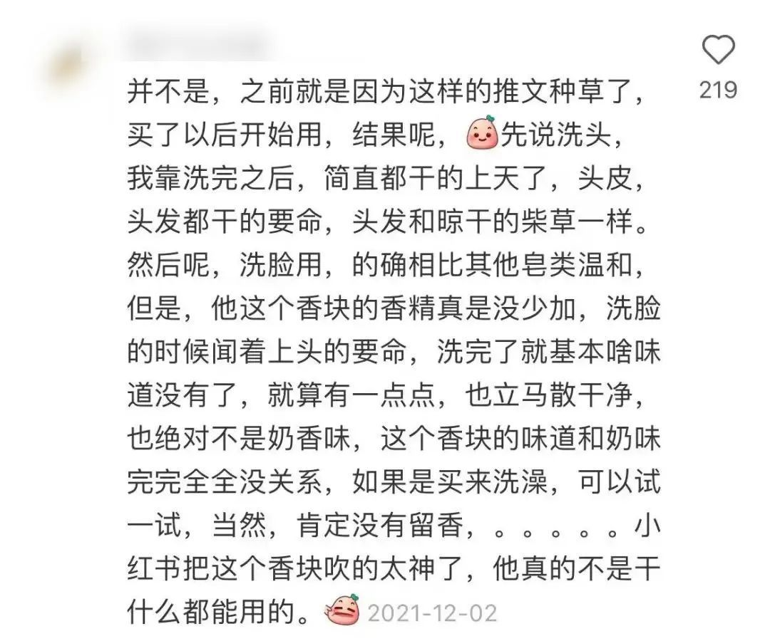 但评论里就有不少网友表示,之前也是因为类似的推文被种草了,“买了之后洗头干得要命、洗脸闻着全是香精”,“被吹得太神了”。
