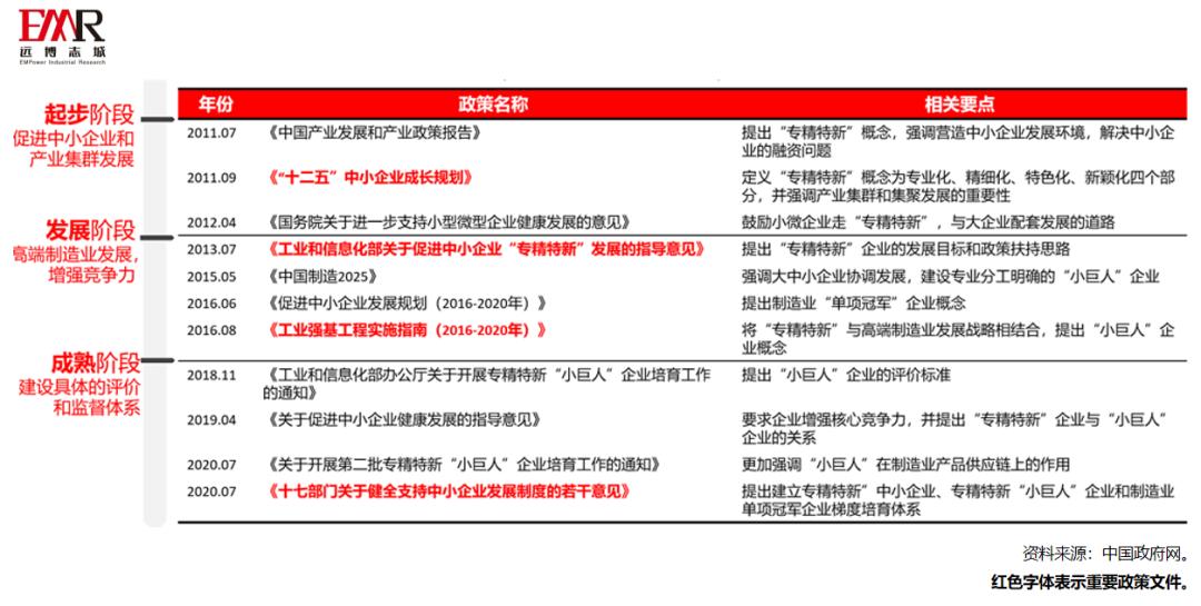 自2011年提出相关概念后,“专精特新”政策经过了三个阶段:促进中小企业发展、促进高端制造业发展、建立中小企业-“小巨人”-领军企业的梯度培养和评价体系。2011-2015年是政策的起步阶段:政府意在优化中小企业营商环境,解决中小企业的“融资难”问题。2015年-2020年是政策的发展阶段:政府更加强调中高端制造业发展、补齐国内产业链短板。2020年后是政策的成熟阶段:“小巨人”、制造业“单项冠军”等概念的出台和整合标志着“专精特新”培育、监督和评价体系的建立。