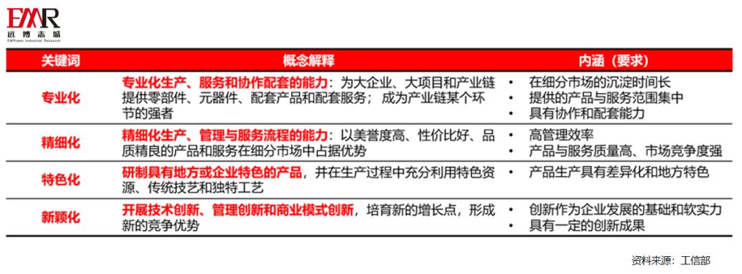 “专精特新”最早在2011年提出,包含专业化、精细化、特色化和新颖化四个维度。四个维度分别就企业的生产领域,产品与服务的质量、独特性和创新性提出了要求:企业需为产业链的细分领域服务;企业产品需在制作工艺、功能与适用性等层面具有独特优势,能够创造或垄断细分市场。“专精特新”概念的建立代表政府希望引导中小企业专注于产业链、价值链的细分领域,实现创新驱动和集约发展。
