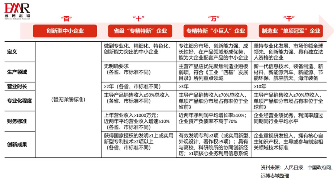 “专精特新”包含专业化、精细化、特色化和新颖化四个维度。政府建立了创新型中小企业-省级“专精特新”企业-专精特新“小巨人”企业-制造业“单项冠军”企业的“梯度培育体系,并在资金、平台、市场等多个层面提供政策支持。