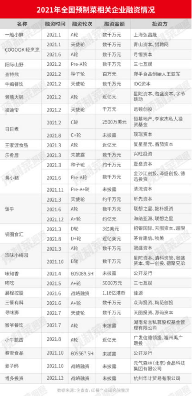 近两年,预制菜更是迎来了融资的高光时刻。8月初,红餐产业研究院就盘点了过去一年半,全国预制菜相关企业融资情况,发现仅2021年到2022年3月这一年多以来,预制菜领域就发生了40余起融资项目,以亿级元为单位的大额融资也不鲜见,像厚生、红杉、高瓴、IDG等头部资本也相继加码这一赛道。