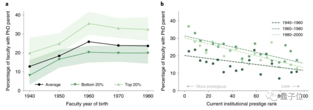 他们对1940年-1980年期间的博士父母进行分析,发现近50年里终身教授中父母拥有博士学位的比例稳定保持在20%以上。