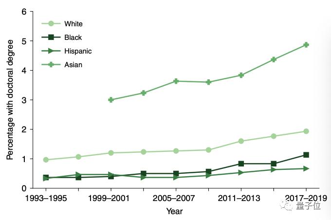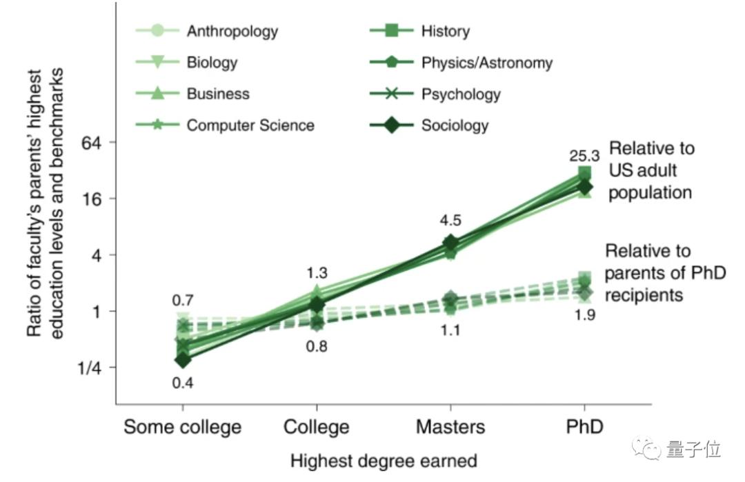 除此之外,研究者还考虑到少数族裔的情况,并得出结论:黑人或拉美裔在学术圈中的代际传递更差。