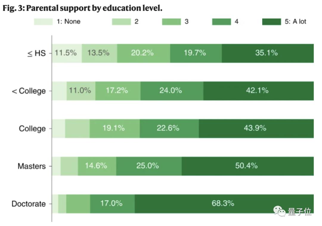 首先,研究人员分析了父母们给孩子们的学术支持:拥有博士学位的父母,给予孩子们在学术职业发展中的支持和鼓励最多。