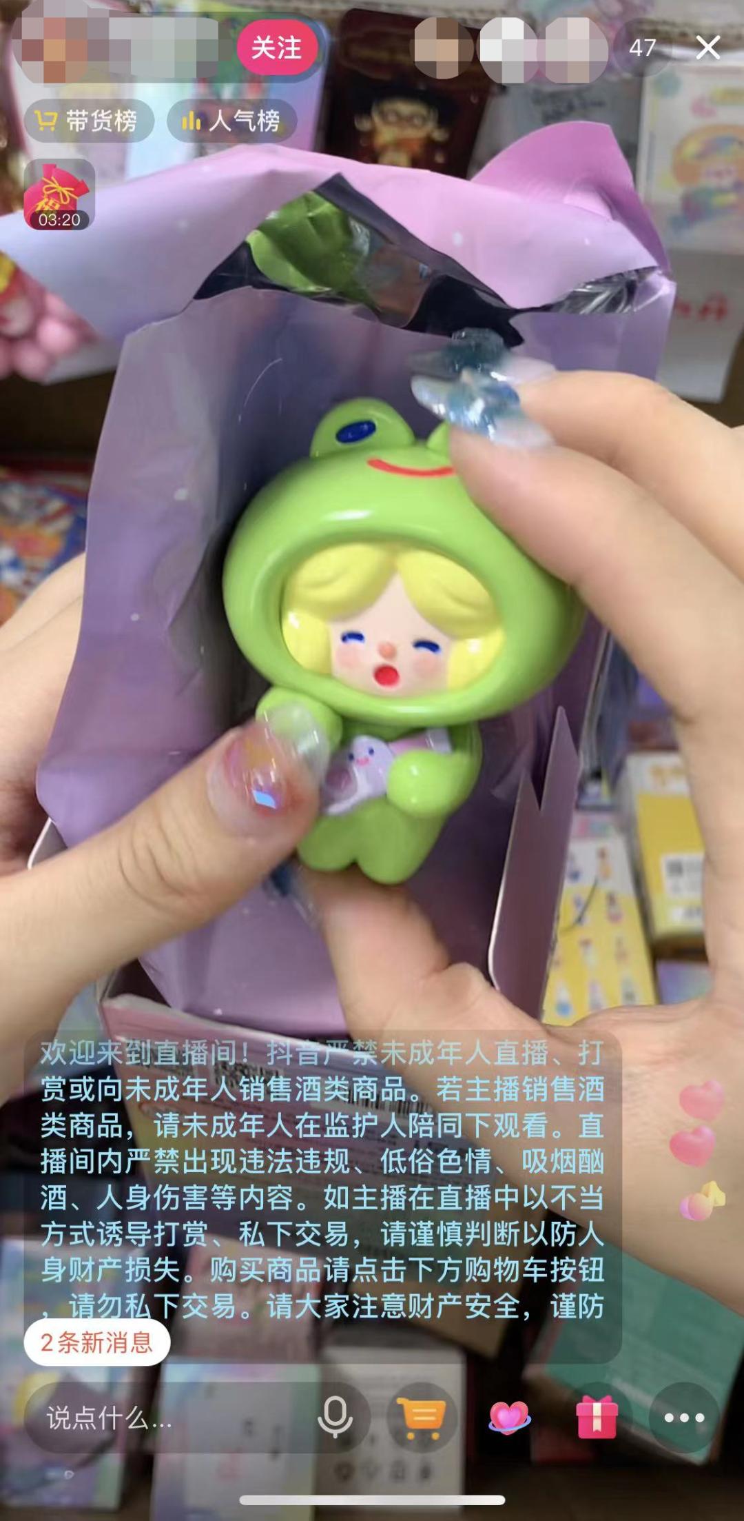抽奖则是盲盒直播间的常见玩法,观众支付一定金额之后指定自己想要的盲盒,主播当众拆开,向观众展示盲盒内容,然后再当众封盒,邮寄给观众。在这过程中,最让观众感兴趣的是,是否能开出隐藏款。