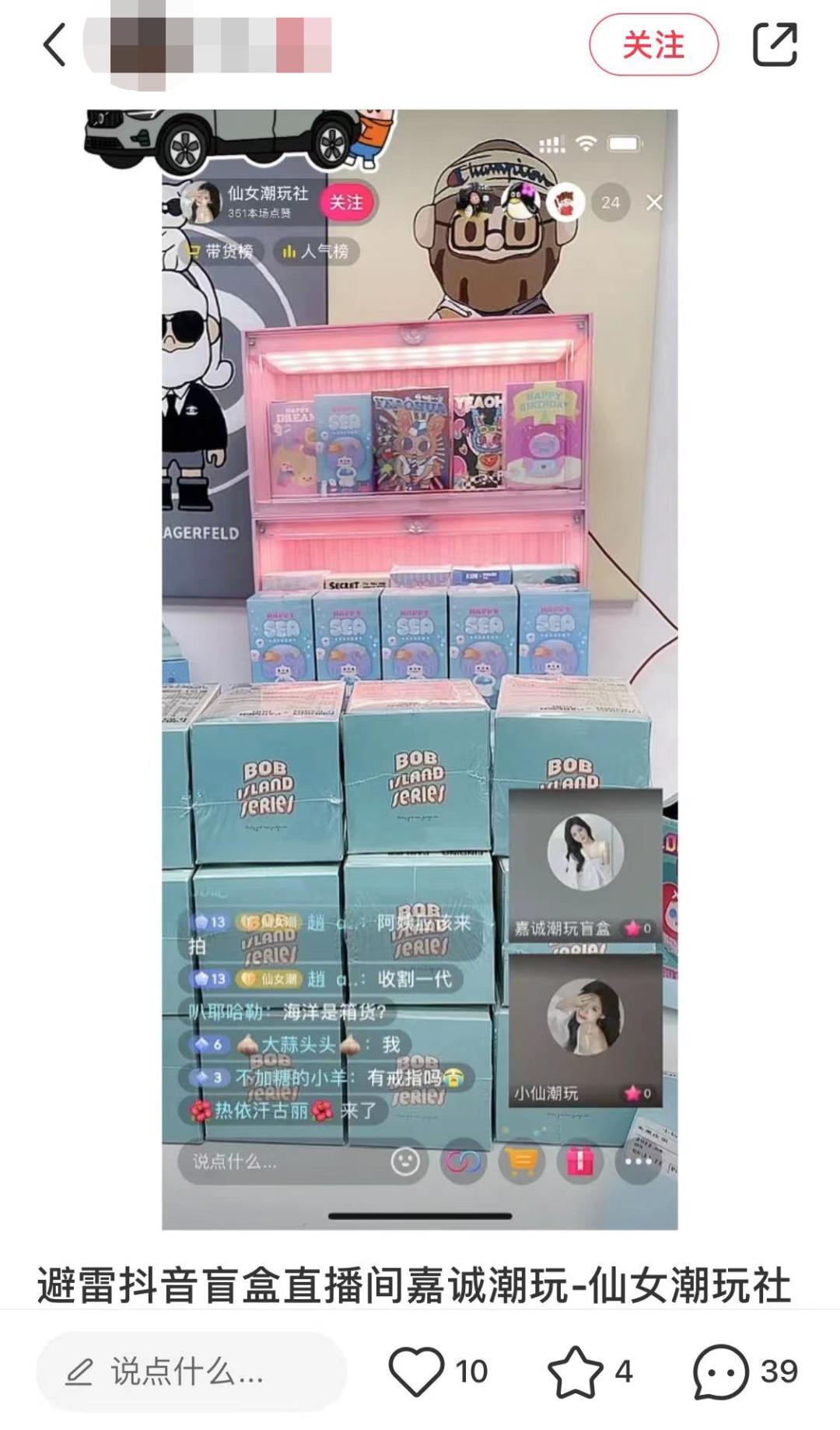 在一个名为“仙女潮玩社”的直播间,有观众对比官方旗舰店的全新盲盒后发现,主播声称的全新未拆封盲盒是重新塑封的,很有可能是已拆盒的二手盲盒伪装成全新盲盒,高价卖出。