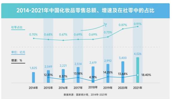 国家统计局数据显示,2015-2021的7年间,有5年时间化妆品零售增速维持在10%以上。值得一提的是,即使新冠疫情出现在2020年,市场增速仍高达13.64%。